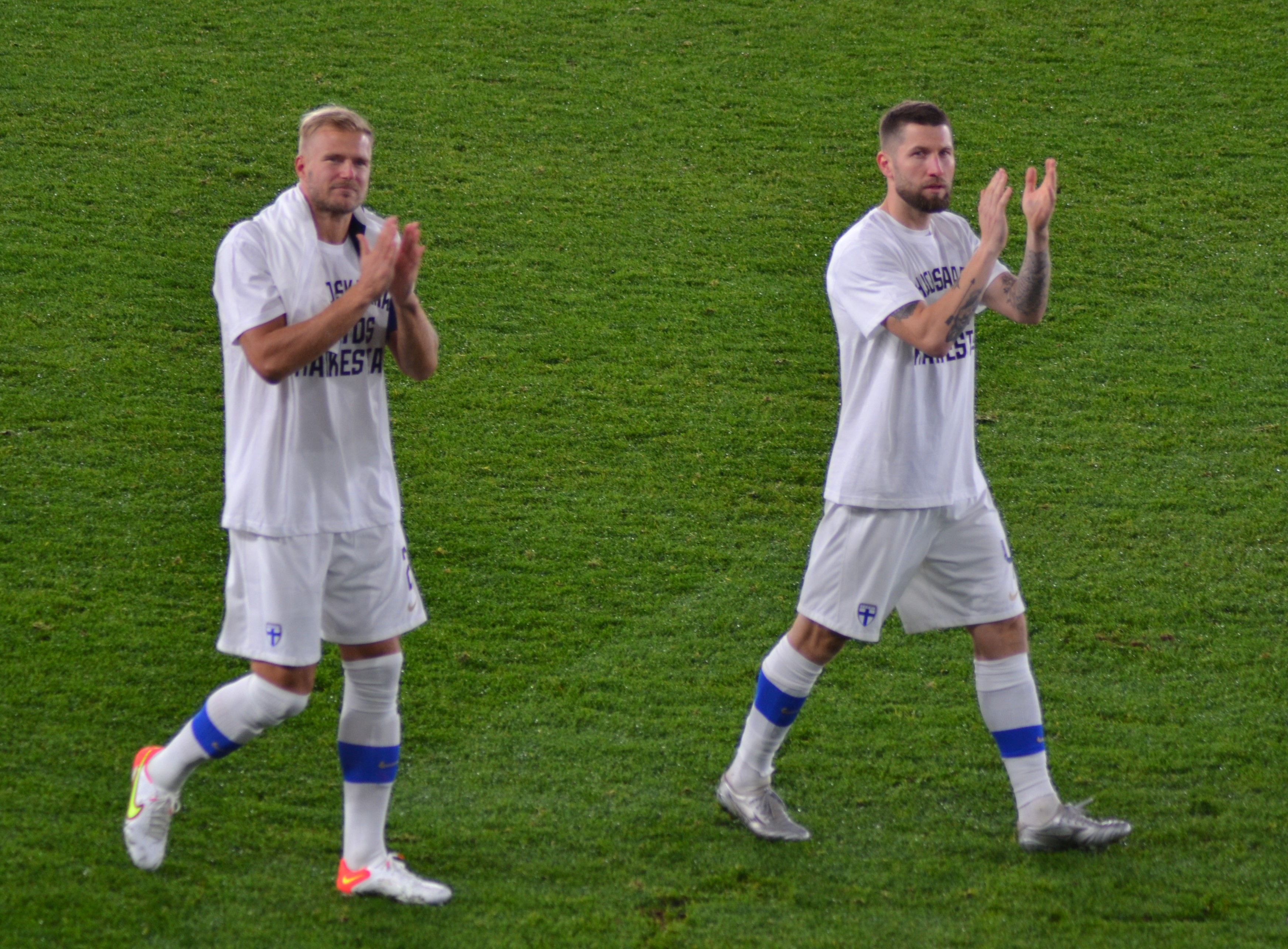 Joona Toivion ja Paulus Arajuuren upeat maajoukkueurat päättyivät tiistaina sateisella Olympiastadionilla. Topparikaksikko jätti tunteikkaat jäähyväiset kotiyleisölle ja Pohjoiskaarteelle 0-2-tappioon päättyneen Ranska-ottelun jälkeen. - Kaksi upeaa pelaajaa ja persoonaa lopetti maajoukkueuransa. Heidän kanssaan on tullut henkilökohtaisesti aika pitkä matka kuljettua. Valmensin heitä jo alle 21-vuotiaiden maajoukkueessa. He ovat antaneet hienon panoksen suomalaiselle jalkapallolle ja Huuhkajille. Heitä tulee ikävä, päävalmentaja Markku Kanerva sanoi ottelun jälkeen. Toivio ja Arajuuri muodostivat pitkään Huuhkajien puolustuksen selkärangan. Jo juniorivuosina ensimmäisen kerran yhdessä pelanannut kaksikko oli avainasemassa, kun Huuhkajat selvitti tiensä viime kesän EM-lopputurnaukseen.